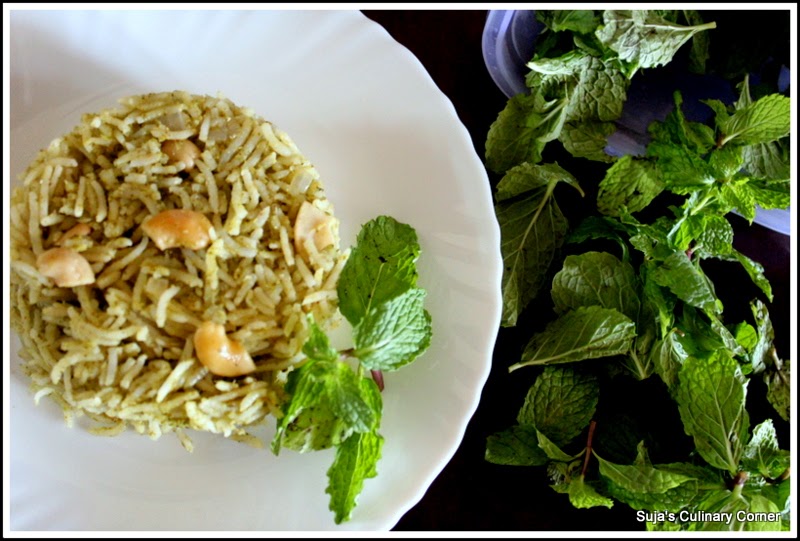 Mint rice is a very refreshing and satisfying one pot meal which can be prepared in a jiffy and also an ideal lunch box recipe.My mom used to make this often when we were kids and in fact we used to have it for dinner also when we run out of tiffen ideas.Mint rice tastes delicious with a simple raita and I like to eat just like that even without a side dish.It is quite similar to coriander rice but has an intense mint flavor and awesome taste.I added the whole garam masala for tempering as my son always prefers any variety rice in pulao style.You can omit it and yet the Mint rice tastes yummy.